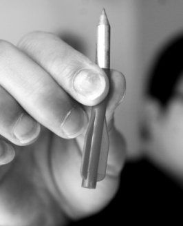 木板墻上留下很多洞孔,有類似釘子釘穿的痕跡。公司工作人員證實(shí),這些都是歹徒用弩射擊的彈痕。記者看到,“子彈”是由3公分左右長(zhǎng)的尖鋼釘和3公分左右長(zhǎng)的螺旋狀紅色塑料連接而成。