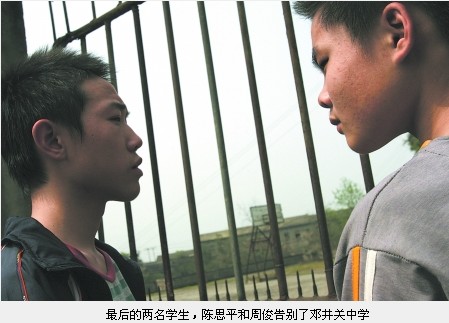 3月22日,陳思平和周俊,鄧井關中學的最后兩名學生,在學校門前站立半晌后轉(zhuǎn)身離去。這個讀了三年的學校從此不屬于他們。教育部門給他們聯(lián)系到一所職業(yè)中學就讀。十天前,富順縣鄧井關中學因“14名教師教2名學生”的狀況而名聞一時,被網(wǎng)友戲稱為“史上最牛中學”。最后的兩名學生終于走了,鄧井關中學在為眾人所知后,悄然謝幕。