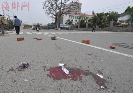 記者趕到現(xiàn)場時,老人剛被送往醫(yī)院,路面上滿是血跡。警方正在用磚頭圍著的事故現(xiàn)場勘查!爱敃r那名老人從分院走出來,過斑馬線時,一輛摩托車從他后面撞了上去!币荒繐粽哒f,那輛“黑色,很新”的摩托車速度很快,“老人被撞得飛起,在地上滾了幾下,躺在路上呻吟著,頭上、腳上都是血!