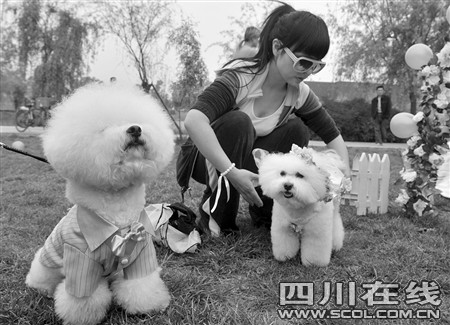 昨天下午3點(diǎn),成都非物質(zhì)文化遺產(chǎn)國(guó)家公園內(nèi)響起了結(jié)婚進(jìn)行曲,正當(dāng)市民們駐足想看下新人的模樣時(shí),兩只白色的比熊犬身穿鮮艷禮服走上紅地毯,突然闖進(jìn)大家的視野。原來(lái),它們就是這場(chǎng)婚禮的主角。13套豪華禮服,紅毯花房,“狗友”證婚還有入洞房等等,一樣都不能少。主人請(qǐng)人專(zhuān)門(mén)為狗狗策劃、舉行這么隆重的婚禮,數(shù)百在場(chǎng)市民對(duì)此褒貶不一……