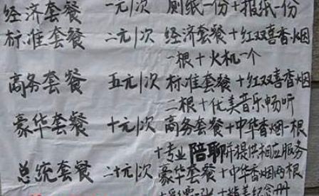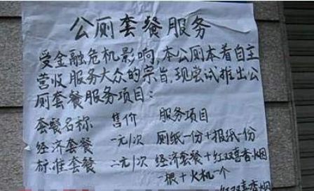 據(jù)悉,告示上將該項服務(wù)分為五個等級,分別是經(jīng)濟套餐、標(biāo)準(zhǔn)套餐、商務(wù)套餐、豪華套餐、總統(tǒng)套餐。每個套餐還列出了各自的服務(wù)項目。例如經(jīng)濟套餐就贈送廁紙一份、報紙一份,收費也相當(dāng)?shù)土,僅僅需要一元;2元的標(biāo)準(zhǔn)套餐則在經(jīng)濟套餐的基礎(chǔ)上送出紅雙喜香煙一根火機一個。最雷人的應(yīng)該算是價值10元的豪華套餐,竟然有專業(yè)陪聊的服務(wù)項目。而20元的總統(tǒng)套餐也讓人摸不著頭腦,居然包括彩票一張和精美紀(jì)念冊。這些都讓網(wǎng)友們好奇不已:不知道當(dāng)你如廁的時候,有人在一旁陪你談心,會是什么樣的感受?而精美紀(jì)念冊的內(nèi)容,又會是什么?
