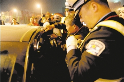 17日22時(shí)30分,記者趕到桐柏路與隴海路口東北角,只見(jiàn)一輛轎車(chē)停在路口,交警二大隊(duì)一中隊(duì)指導(dǎo)員潘亞文帶著8名民警,還有市交警八大隊(duì)6名民警,圍著這輛轎車(chē),不停向車(chē)窗內(nèi)的司機(jī)示意讓他開(kāi)門(mén)。記者看到車(chē)內(nèi)共有3人,戴著眼鏡的司機(jī)伏在方向盤(pán)上,任窗外民警怎么叫都毫無(wú)反應(yīng)。此時(shí),一輛警務(wù)拖車(chē)也趕到現(xiàn)場(chǎng),因?yàn)榕峦宪?chē)時(shí)車(chē)內(nèi)乘客跳車(chē)受傷,所以,警方?jīng)]有動(dòng)用拖車(chē)。潘亞文介紹,當(dāng)夜是統(tǒng)一對(duì)全市酒后駕駛機(jī)動(dòng)車(chē)大檢查,大約21時(shí)40分,他們?cè)诖寺房诎l(fā)現(xiàn)這輛車(chē)行駛隨意變更車(chē)道,就示意車(chē)停下檢查。“車(chē)停下后,我示意司機(jī)出示駕照,司機(jī)把駕照交給我,我同時(shí)聞到他身上酒氣很濃,就拿出酒精測(cè)試儀讓他吹,沒(méi)想到司機(jī)突然關(guān)了車(chē)門(mén),我們喊了他們一個(gè)小時(shí)了,他們就是不出來(lái)!迸酥笇(dǎo)員把這名司機(jī)的駕照出示給記者,照上寫(xiě)著“方志剛,二七隴海中路36號(hào)”字樣。