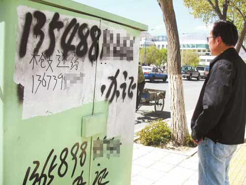 住在娘熱路附近的卓女士告訴,一些涂寫非法小廣告的人都是趁天黑或早上人比較少的時候伺機作案。他們這些人就是和管理部門‘打游擊’,很難被抓住。”卓女士告訴記者,拉薩是自治區(qū)的首府城市,而娘熱路是我市的一條主要干道,違法分子到處亂涂亂寫非法廣告嚴重影響了市容市貌,出售“槍支迷藥”的非法小廣告出現(xiàn)在城市中心地帶更會讓內(nèi)地游客擔(dān)心拉薩的社會治安,從而給拉薩的經(jīng)濟社會發(fā)展帶來不小危害,希望有關(guān)部門進一步加大工作力度,狠狠打擊這些違法分子。
