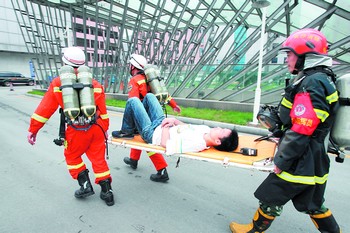 荷花園電信大樓高218米,共有地面建筑42層,是典型的超高層建筑。在昨日的演練中,最引人矚目的是高層供水加壓項目!霸诟邔咏ㄖ馂(zāi)中,當(dāng)消防戰(zhàn)士進入火場時,難免會遇到室內(nèi)消火栓斷水的情況,這就要求我們必須有備用方案!笔邢乐ш爡⒅\長葛佳軍告訴記者,此次演練的主要內(nèi)容之一就是高空加壓。此次假設(shè)的起火點位于39層,在消防車的轟鳴聲中,水帶迅速充足,一條白色的水龍沖天而起!澳壳,我們的高空加壓垂直高度可達到280米左右!备鸺衍娬f。(記者 千靈坡)