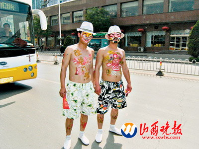 兩位男青年頭戴白色禮帽,身穿沙灘褲,上身赤裸,前胸和后背涂著五顏六色的圖案,還寫有商家的廣告詞,不少行人向他們投來異樣的目光。記者看了半天才明白,原來他們是“人體廣告”。