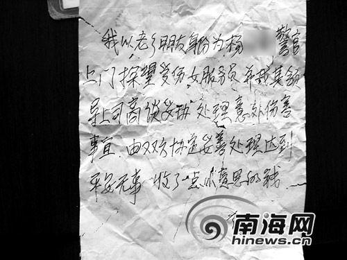 楊警官要求蔡某寫下一張收條,蔡某當場寫道:我以老鄉(xiāng)朋友身份為楊警官上門探望受傷女服務(wù)員,并找其領(lǐng)導(dǎo)上司商談妥協(xié)處理意外傷害事宜,由雙方協(xié)定妥善處理達到平安無事,收了一點小意思的錢。