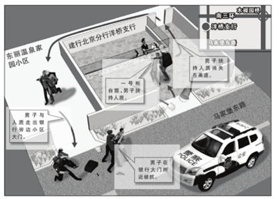 一號柜臺是一名男業(yè)務(wù)員,表現(xiàn)得比較冷靜。業(yè)務(wù)員邊勸其冷靜,邊將一沓沓百元人民幣推到窗外,整個動作很緩慢。劫匪情緒激動,一直在催促動作快些。幾分鐘后,劫匪顯然失去耐性,將已經(jīng)拿出的現(xiàn)金裝到黑色背包中。據(jù)警方事后發(fā)布,被裝進(jìn)背包的現(xiàn)金共14萬元。劫匪勒著喬女士的脖子向大廳內(nèi)側(cè)的通道走去。其間,喬女士在不停叫喊,這時門口的人才看到,在劫匪的左手上還有一把刀架在喬女士脖子上,右手黑色手槍卻沒有指著人質(zhì),帶著人質(zhì)消失在甬道內(nèi)。