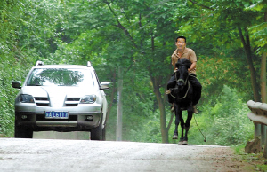 在天坪村公路上,記者找來(lái)一輛三菱車,想與“大黑”比試跑1公里!按蠛凇眳s犯倔了,怎么也不讓主人上馬。張興福便貼在它耳邊悄悄地說(shuō)“你是好兄弟”、“你跑好了,給你草料吃”等好話,它才不情不愿地聽(tīng)了話。