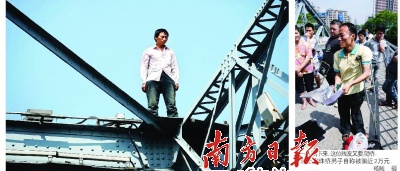 海珠橋,儼然成了“跳橋圣地”,F(xiàn)場幾位媒體同行揶揄說,全城應(yīng)該集體封殺海珠橋。是的,同樣是這個(gè)殘疾男人道出了大多數(shù)跳橋者的心聲,“只有這里,才能吸引社會的關(guān)注!泵恳淮魏V闃蛱鴺蛐,全城媒體幾乎都要出動。