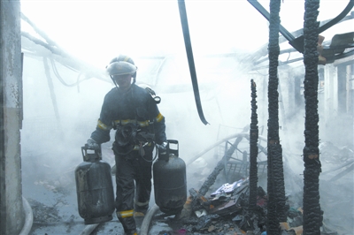 據(jù)附近居民吳女士介紹,昨日上午11時30分,她正在家里做飯,突然有人大喊“失火了”。吳女士出門一看,院內(nèi)一幢5層宿舍樓樓頂火光沖天。該樓本只有4層,后來在樓頂加蓋了7間磚木結(jié)構(gòu)的簡易房,大火燃起后迅速蔓延,居民紛紛跑下樓逃生,但有一名中年婦女帶著兩名女孩子被大火堵住去路,只好躲在一個小陽臺上大聲呼救。