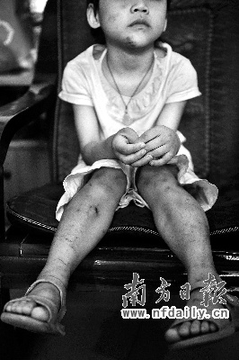 “身上還疼”,心怡見到記者時(shí)說。昨日下午,記者在廣州市花都區(qū)政府附近某幼兒園見到了她。其臉上有7處長短不一的傷痕,腦門上的一處還出血,下巴處硬幣大小的瘀傷分外明顯,“這是媽媽拉我,我倒在地上時(shí)摔的”。她的兩條胳膊同樣是傷痕累累,右手腕腫脹變形,腿和腳上傷痕密集,右腿上一處約2厘米長的傷痕已經(jīng)淤血化膿。當(dāng)幼兒園老師掀起心怡的衣服時(shí),其背部、臀部成片的紅色條狀傷痕顯露出現(xiàn)。有的傷痕明顯是不同時(shí)間毆打,舊傷未愈又添新痕。記者粗略計(jì)算,外傷不止70處。