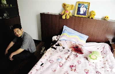 昨日上午,記者驅(qū)車趕到現(xiàn)場。走進房間,防盜門、窗戶、地板、床上到處都是血跡。兩間臥室的席夢思被燒糊。