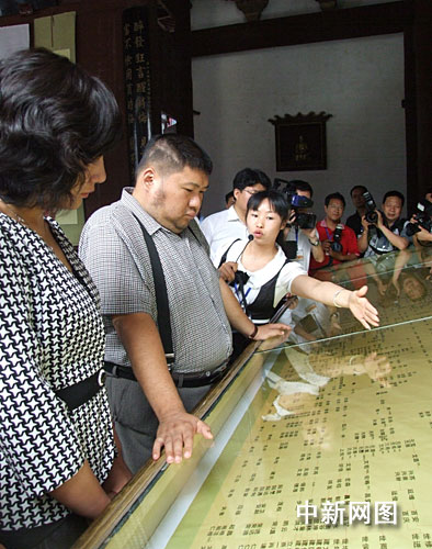 今天,聽說(shuō)毛澤東的孫子要回來(lái)尋根了,老老少少的清漾村村民早就等在了村口,村中的喇叭更是唱起了《北京有個(gè)金太陽(yáng)》等革命經(jīng)典老歌。在熱烈的氣氛中,毛新宇夫婦走下了車子,他們親切地向村民微笑示意,舉手投足間流露出了對(duì)這片土地特有的感情。在群眾的簇?fù)硐,毛新宇夫婦邁進(jìn)了清漾祖宅大門。在合敬堂里,他們饒有興趣地翻閱了《清漾毛氏族譜》,并且聆聽了江南毛氏衍脈和族譜的介紹,當(dāng)?shù)弥约菏墙厦系?8代嫡孫時(shí),毛新宇不住微微頷首。