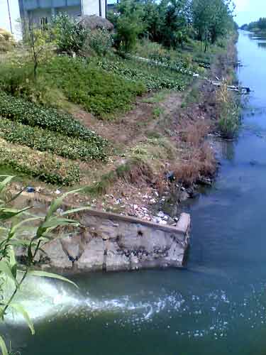 離排污口約50米,記者就聞到了惡臭,而在入河口處,溝邊不足10米就是民居。這條排污溝約一米深,兩側(cè)雜草蔥綠茂密,但浸在水中的部分都包裹著白色的絮狀物。記者沿著排污溝往東尋找,終于發(fā)現(xiàn)大片的廠房,化工廠一家連著一家。當(dāng)?shù)鼐用窀嬖V記者,這條溝過去是水很好的,灌溉都用它,目前的污染約有六七年了,前面的一些小企業(yè),根本沒有將污水凈化就排出,當(dāng)?shù)毓賳T都知道,所以向誰反映都沒用。當(dāng)?shù)鼐用襁說,這條河是西戰(zhàn)備河,還有個(gè)東戰(zhàn)備河,那里的水幾乎和墨水一樣,也都是化工產(chǎn)業(yè)的杰作,這兩條河都通大運(yùn)河。