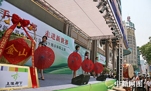 在新世界城廣場上,廊下土布時(shí)裝表演秀驚艷了南京路。一批做工精美、款式素雅、色彩純樸的江南農(nóng)村土布服飾吸引了滬上市民的眼球。風(fēng)韻十足的旗袍、藍(lán)印花布裁制的衣裙、舊時(shí)上海小姐的嫁衣,無不勾起滬人對充滿上世紀(jì)三十年代老上海情調(diào)的土布服飾的回味。