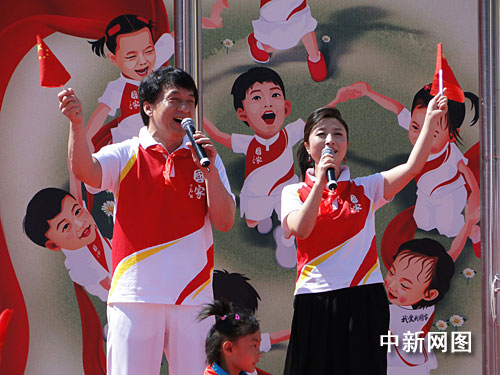 中新網(wǎng)5月31日電 5月31日,國(guó)慶獻(xiàn)禮歌曲《國(guó)家》的主唱成龍、劉媛媛分別來(lái)到北京市七一小學(xué)、府學(xué)小學(xué)及中國(guó)兒童中心,與孩子們共同參加了形式各異,精彩紛呈的慶六一活動(dòng)。