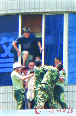 中午12時左右,4名消防官兵突然從另外一邊的窗口出現(xiàn)在平臺上,由于平臺是繞著醫(yī)院的柱形墻體修建的,挾持人質(zhì)的女子并沒有發(fā)現(xiàn)救援的官兵。趁著談判人員吸引該女子注意力的時候,四名消防官兵慢慢向女子所站的地方接近。