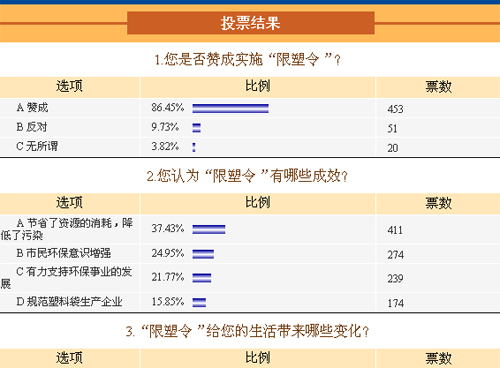 在參與調(diào)查的網(wǎng)友中,有86.71%贊成實(shí)施“限塑令”,僅有9.44%表示反對(duì)。