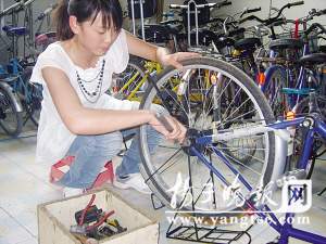 在無錫商業(yè)職業(yè)技術(shù)學(xué)院創(chuàng)業(yè)教育園里面有一家“奇·騎車行”,主營自行車租賃和維修,在整個藕塘職教園區(qū)都很有知名度。讓人想不到的是,這家車行的“主人”竟然是一名23歲的在校女大學(xué)生,一位自行車的維修高手。昨天,記者在學(xué)校里見到了這位來自連云港的大三女孩姚莉娟。小姚給人的第一印象就是身材高挑,漂亮大方,大學(xué)生美女這些詞匯怎么也和修車掛不上關(guān)系。自從愛上修車之后,她整天和油污、機(jī)械打交道,靠著自己的勤勞和智慧,被大家稱為大學(xué)里的最美“修車匠”。