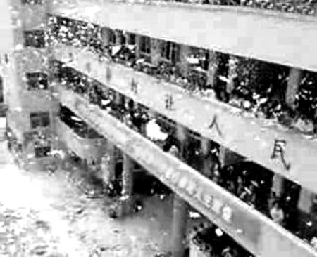 昨日,記者在某著名視頻網站上看到了該視頻:整個教學樓一片混亂,不少學生都將課本、復習資料撕掉,從樓上往下扔,紛紛揚揚的紙片如暴雪一般落下,教學樓前的空地則全是書本碎片,視頻里還可以聽到學生的歡呼聲,整個視頻時長40秒。