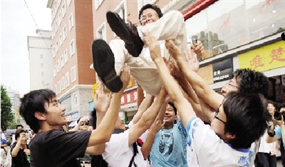 高考最后一門英語(yǔ)結(jié)束了,對(duì)緊繃的高三學(xué)生來(lái)說(shuō),這是一個(gè)歡樂的時(shí)刻,輕松的時(shí)刻。周南中學(xué)十幾名高三學(xué)生,剛走出長(zhǎng)沙一中考點(diǎn),便將班主任吳老師舉起拋向了空中。
