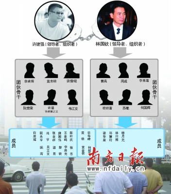 許建強為首成立了“閘坡鴻發(fā)水產品購銷部”等一系列公司,以暴力、脅迫等手段實施故意殺人、故意傷害、敲詐勒索、強迫交易和非法收取保護費等違法犯罪行為,壟斷了陽江部分地區(qū)的海鮮、冰條、螺仔、三鳥、沙石、煤氣、客運、運輸物流市場。林國欽為首則成立了信誠寄賣行等一系列公司,同樣以暴力、脅迫手段實施了故意傷害、強迫交易、非法經營等違法犯罪活動,基本壟斷了陽江的水泥銷售市場,在追收非法債務過程中,逼迫他人以山林、廠房抵債,大肆掠奪他人或企業(yè)財產,甚至導致有的企業(yè)破產倒閉。陽江地區(qū)的社會穩(wěn)定及經濟發(fā)展受到了嚴重影響。