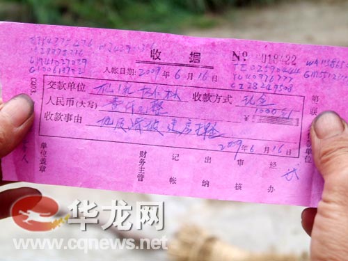 聞聽記者在當(dāng)?shù)夭稍L,村民楊仁林的妻子將隨身攜帶的押金收據(jù)拿出來展示,楊仁林家編號為0018422號的白條“收據(jù)”上顯示,其收款事由為“‘地質(zhì)滑坡建房押金’壹仟元整”,交款時間為2009年6月16日,經(jīng)辦人:“武”。收據(jù)左右角上注明了其交款面額的編號。