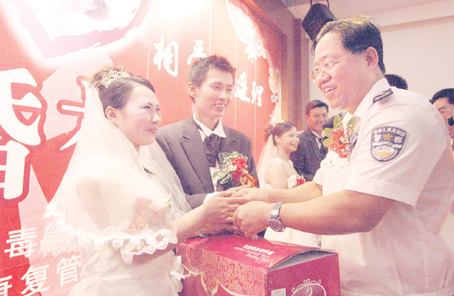 在鞭炮聲中,新郎們把身著婚紗的新娘接回康復所為他們免費提供的新房。之后,隨著婚禮進行曲響起,3對新人相挽著步入康復所內(nèi)布置的婚禮儀式現(xiàn)場。廣東電視臺主持人侯玉婷為他們主持了婚禮儀式,廣東省戒毒管理局局長施紅輝為3對新人證婚。施紅輝說:“這是全國戒毒康復場所的首次集體婚禮!