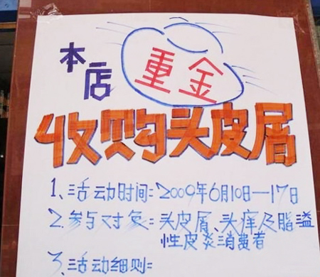 在朝聞網(wǎng)、搜狐社區(qū)、新浪論壇上,一篇名為《暴強(qiáng)!藥店竟然收購(gòu)頭皮屑》的帖子,引發(fā)網(wǎng)友熱議。帖中說(shuō),自己在經(jīng)過(guò)住地附近的一家藥店時(shí)看到,店門口竟貼出一張海報(bào)要收購(gòu)頭屑!這可怎么算,按斤稱?論兩算?不是,是以片兒算,店方開出了每片頭屑100元的天價(jià)。樓主驚嘆,見過(guò)收廢品收古董啥的,“這回我真是被雷著了!我看這藥店老板肯定是個(gè)腦殘,還不如直接送錢好了……”