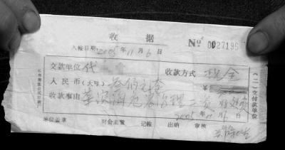 代向記者展示了這個“最牛收據(jù)”,收據(jù)的時間為2005年11月6日,收款人名為鄭和生,收款事由一項竟明確寫著:“菜家溝危巖治理工資好處費”。代某介紹,鄭和生當(dāng)時為12組組長。收款時,鄭稱,自己為村民拿到征地補償,需要請客吃飯,耽誤時間,所以在他們的征地補償中扣除了300元,并寫下了收據(jù)。事后,代某又多次找到鄉(xiāng)政府、村委會,要求提供扣除補償款的收據(jù),均遭到拒絕。