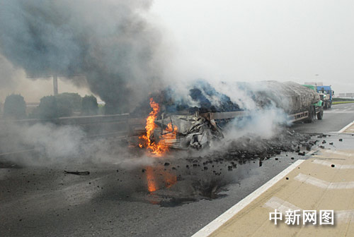 因掛車上裝載的是煤炭屬易燃物品,燃燒產(chǎn)生的煙霧非常大,火勢十分猛烈,轎車內(nèi)人員生死不明。