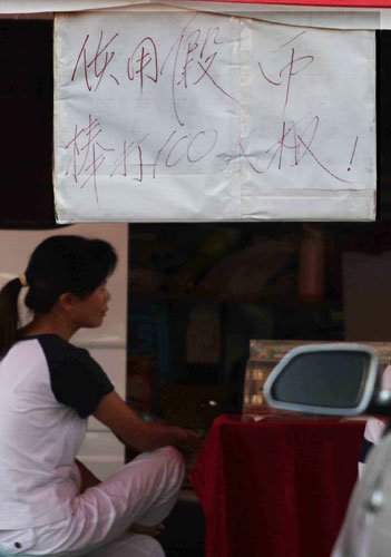 昨日,在西安南郊一彩票購(gòu)買(mǎi)點(diǎn),老板掛出一張寫(xiě)有 “使用假幣,棒打100大板”字樣的紙牌,讓人想到了電視劇中古時(shí)官府衙門(mén)的情景。