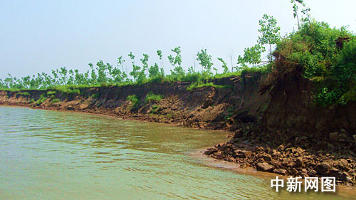 記者現(xiàn)場看到,50多條船滿載石頭,在江中心拋石作業(yè)。江兩岸被江水沖刷,有的地方發(fā)生崩岸,整棵樹倒伏在江岸。