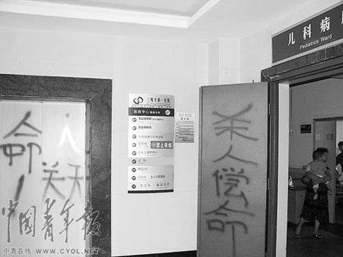 自從李醫(yī)生逃脫后,死者家屬便每天到醫(yī)院示威。據(jù)院方提供的材料,6月29日,死者家屬聚集40余人在醫(yī)院門診、急救中心大廳燃放鞭炮、焚香、燒紙錢、擺放花圈,堵塞急救中心車輛通道,阻礙120急救車輛進(jìn)出,在門診部、急救中心電梯口、墻壁等處噴灑黑漆,寫上“殺人償命、還我女兒”等字;6月30日,死者家屬再次聚集20余人在醫(yī)院急救中心大廳燃放鞭炮,急診科搶救室有大量的氧氣瓶和各種搶救設(shè)備,萬一引起燃燒或爆炸,后果不堪設(shè)想;7月1日,死者家屬在門診大樓外拉橫幅,放鞭炮,將紙錢拋撒進(jìn)收費(fèi)處窗口。院方說,這種聚眾鬧事的行為,嚴(yán)重干擾醫(yī)院正常診療秩序,搞得醫(yī)務(wù)人員人心惶惶,無法安心工作。院方認(rèn)為,死者家屬不愿通過正常渠道解決問題,并拒絕尸體解剖,“企圖通過鬧事來擴(kuò)大事端,給醫(yī)院造成負(fù)面影響,對(duì)醫(yī)院施加壓力,從中牟取經(jīng)濟(jì)利益”。