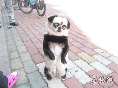兩只拳頭大小的黑眼圈,短小的黑耳朵,圓圓的臉,肥身體,四肢及胸部為黑顏色,其余毛色均為白色。從遠(yuǎn)處慢騰騰的走過來,人們都以為這是一只憨態(tài)可掬的小熊貓?墒聦(shí)是,這是一只被主人染成熊貓模樣的小狗。