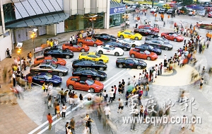 當(dāng)天下午6時(shí)許,車友們開(kāi)車來(lái)到觀音橋步行街,準(zhǔn)備找一個(gè)地方集體聚餐,結(jié)果到了后發(fā)現(xiàn)停車場(chǎng)一下停不了這么多車,只有2輛停在了車庫(kù),并造成了停車場(chǎng)擁堵。沒(méi)辦法,車友會(huì)只得求助龍湖北城天街物管公司,申請(qǐng)?jiān)诼短鞆V場(chǎng)停車,并安排保安值守。于是剩余的23輛被迫停放在了露天廣場(chǎng)上。鄭說(shuō),由于停放在露天廣場(chǎng)上的停車費(fèi)用比地下車庫(kù)要貴些,物管公司將按規(guī)定收費(fèi),不會(huì)免費(fèi)服務(wù),也不會(huì)因?yàn)檐囍鱾兌际莾|萬(wàn)富翁而多收費(fèi)。