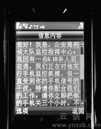 “您好!我是公安局刑偵大隊監(jiān)控指揮中心:現(xiàn)因有一名6.18殺人犯在逃……請你立即關(guān)閉手機三小時,否則拘留七至十五天。”接到這樣的短信后,岳代林相信了,關(guān)閉了手機。然而發(fā)短信的人卻利用他關(guān)電話的空當(dāng),向他身在四川的家屬謊報他出了“車禍”。然而假的真不了,再高明的騙局遲早也要“露餡”。