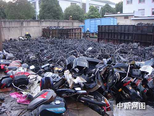 中新網(wǎng)寧波7月8日電(何蔣勇 歐陽(yáng)峰)7日下午5時(shí)50分許,位于浙江省寧海縣興寧中路45號(hào)的寧?h物資再生利用有限公司發(fā)生一起火災(zāi),濃煙沖天達(dá)百余米高,整個(gè)寧?h城都能清楚地看到黑煙滾滾。當(dāng)?shù)叵啦块T先后出動(dòng)四輛消防車、近四十余名官兵參與火災(zāi)撲救,約40分鐘后成功將大火撲滅,但是該公司露天堆場(chǎng)內(nèi)近百輛廢舊摩托車被大火燒成骨架。
