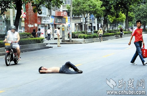 事發(fā)昨日正午,記者在漢陽(yáng)郭茨口看到,一名男子上身裸露,手提一袋醫(yī)院的病歷資料,情緒激動(dòng)地躺在馬路中央,脊背被路面燙得通紅。此時(shí)路面車(chē)流不息,該男子處境十分危險(xiǎn)。“快把他拉回來(lái)!”幾名路人見(jiàn)狀后,靠近該男子,欲將其拉到路邊,但該男子并不領(lǐng)情,堅(jiān)決不起身。幾分鐘后,二橋派出所的民警趕來(lái),要求該男子去派出所再說(shuō),該男子置之不理。民警表示,早8時(shí)許和10時(shí)許,該男子曾在附近路面躺過(guò)兩次,都被他們帶回了派出所,他們這已是第三次為該男子出警。“有什么委屈就說(shuō)出來(lái),那樣心里痛快點(diǎn)!币(jiàn)民警束手無(wú)策,熱心路人們開(kāi)始輪番上前勸解。眾路人汗流浹背,頂著烈日站在馬路中央,對(duì)該男子動(dòng)之以情、曉之以理。半小時(shí)后,該男子陸續(xù)說(shuō)出了心中的不快。又經(jīng)勸解,該男子終于答應(yīng)跟民警回派出所,將事情說(shuō)清楚。