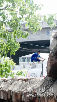 停車(chē)場(chǎng)的上面就是鄂黃大橋,記者繞行來(lái)到橋上面。剛找準(zhǔn)位置停下,就看見(jiàn)一輛車(chē)身上印有“中國(guó)石油”的油罐車(chē)駛?cè)胪\?chē)場(chǎng)。約5分鐘后,一名光著上身的男子開(kāi)著三輪車(chē)駛?cè),?chē)上裝著幾個(gè)大的空塑料油桶和一根塑料油管。油車(chē)司機(jī)迎了上去,并把三輪車(chē)停在油車(chē)的一側(cè)。約十分鐘后,三輪車(chē)駛出停車(chē)場(chǎng),塑料桶內(nèi)已裝滿(mǎn)汽油。
