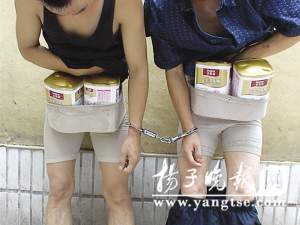 昨天下午3點半左右,兩名男子在南京建寧路一家超市里偷了4聽奶粉藏在內(nèi)褲里準(zhǔn)備偷運(yùn)出超市。在超市門口被保安發(fā)現(xiàn)后,兩人四處逃竄,其中一人跑到奶粉貨架處,脫了褲子就把奶粉放回貨架上,但還是被保安和熱心的市民抓住。令人啼笑皆非的是,偷奶粉的兩名男子竟然各穿了三條女性緊身內(nèi)褲方便作案。