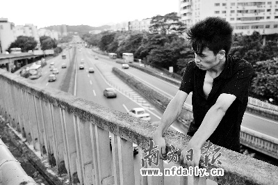 記者趕到現(xiàn)場時,這個穿著黑襯衣、牛仔褲的20多歲的小伙子正站在市二醫(yī)院對面、皇木崗立交橋最高處的護(hù)欄外,與民警對峙。兩輛警車分別停在距離該男子七八米遠(yuǎn)的兩側(cè),幾名民警站在一邊。立交橋下的馬路上,幾名民警已經(jīng)拉開氣墊。