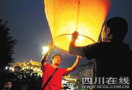 晚8點,合江亭邊天色還未全暗,“范跑跑”身著紅色T恤、休閑短褲和一群藝術(shù)家安靜地坐在竹椅上等候。8點30分左右,德籍華人藝術(shù)家蔡青招呼眾人,《祈愿》正式開始,范跑跑徑直走向安放孔明燈的紙箱旁!拔覀兊目酌鳠羰菑呐_北郵購過來的。除了要用孔明燈為地震逝者祈愿,還寓意海峽兩岸人對生命的尊敬。下面我和范老師將共同放飛孔明燈,愿意參與的市民都可以加入!辈糖嗍谴舜位顒拥闹饕l(fā)起人,作為常年旅居國外的德籍華人藝術(shù)家,蔡青說多次前往映秀、北川等災(zāi)區(qū),大片廢墟令他很震驚。蔡青點燃孔明燈后,邀請“范跑跑”和他共同扶住燈的底框,將高達1米左右的孔明燈逐個放飛。