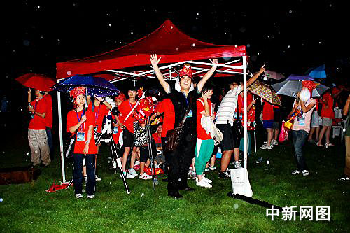烏克蘭日全食觀測(cè)隊(duì)、俄羅斯觀測(cè)隊(duì)、北京日全食觀測(cè)隊(duì)……各個(gè)隊(duì)伍在雨中緊張地等待著,現(xiàn)場(chǎng)的喇叭里不斷傳來其他觀測(cè)點(diǎn)的最新消息,然而8:22分初虧的時(shí)刻到來時(shí),雨未停。終于9:35,日全食的一刻天全部黑了下來,雖然看不到,但現(xiàn)場(chǎng)還是響起了持續(xù)不斷的歡呼和尖叫聲,五分鐘的時(shí)間里,黑暗的山坡上閃關(guān)燈不斷,儼然一個(gè)“巨星演唱會(huì)”的陣勢(shì)。