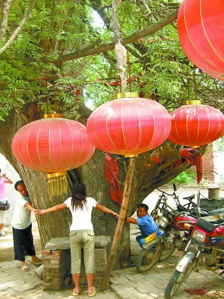 “這棵樹可有年頭。 贝迕駰罡鼈フf,這棵大槐樹已有一千多年的歷史,樹干周長將近5米,5個(gè)成年人才能把這棵大槐樹環(huán)抱住(如圖),偶爾會(huì)有人在樹下燒香,樹洞里布滿了蜘蛛網(wǎng),一直沒人管理。