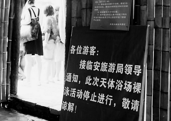 一位男游客率先發(fā)現(xiàn)了公告牌—— “各位游客:接臨安旅游局領(lǐng)導(dǎo)通知,天體浴場(chǎng)裸泳活動(dòng)停止進(jìn)行,請(qǐng)各位原諒!”