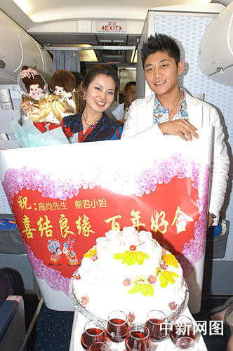 這是二十五日下午東航江蘇公司南京——北京MU二八三一航班上的一幕,客機(jī)在萬(wàn)米高空上演了長(zhǎng)達(dá)十五分鐘的空中求婚儀式。南京準(zhǔn)新娘熊君原本打算和她的家人搭乘此航班飛北京,與北京小伙高尚訂婚,卻中了這突如其來(lái)的甜蜜“埋伏”。