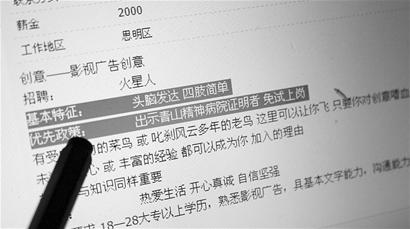 “20—28歲,大專以上學歷,熟悉影視廣告,具基本文字能力,溝通能力強”,除這些簡單明了的硬性規(guī)定外,其他規(guī)定讓不少網(wǎng)友 “百思不得其解”,如:其招聘對象非男非女,而是“外星人”;基本特征則要求:頭腦發(fā)達,四肢簡單;最吸引眼球的還是那所謂的“優(yōu)先政策”,即:出示精神病院證明者,可免試上崗。