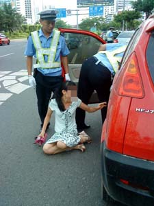 女子見搶不回駕駛證,便開始辱罵交警。這時(shí),現(xiàn)場(chǎng)出現(xiàn)了不少圍觀的市民。就在其他交警拍照取證時(shí),該女子指著一名拍照的交警大聲喝斥“不準(zhǔn)拍照”,F(xiàn)場(chǎng)交警見狀,在請(qǐng)示上級(jí)后,決定以妨礙執(zhí)法暫扣該女子車輛,并對(duì)其進(jìn)行行政拘留。一看到交警準(zhǔn)備拔走車鑰匙,還要拘留她,該女子立即沖回自己車前,坐在地上哭鬧起來(lái)。記者留意到,車內(nèi)還有一名約10歲的男孩,男孩被這一情景嚇哭了。