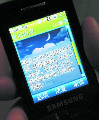 “闊太太俱樂部招男公關,體健貌端,年齡18歲至45歲,月薪過萬元。詳情請咨詢王經理,手機13×××××××××!2008年4月20日,徐州市民張群(化名)突然收到一條招聘短信!霸率杖脒^萬元啊,有這么好的事情!睆埲杭泵仉娫掃M行咨詢。一位自稱李經理的人接了電話,一番詢問后,李經理對張的條件很滿意,并約定在徐州開源名都大酒店(五星級)進行面試!澳愕搅艘院缶偷酱髲d打我電話,我們會派人對你進行考察!崩罱浝碚f。